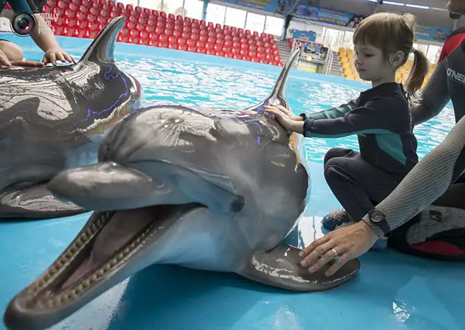 Девочка проходит дельфинотерапию в дельфинарии «Немо» в Киеве.