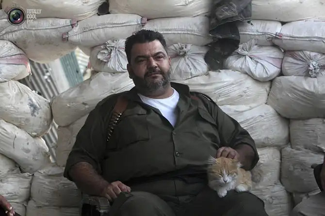 Сирийский повстанец гладит кота, сидя за мешками с песком, в Алеппо.