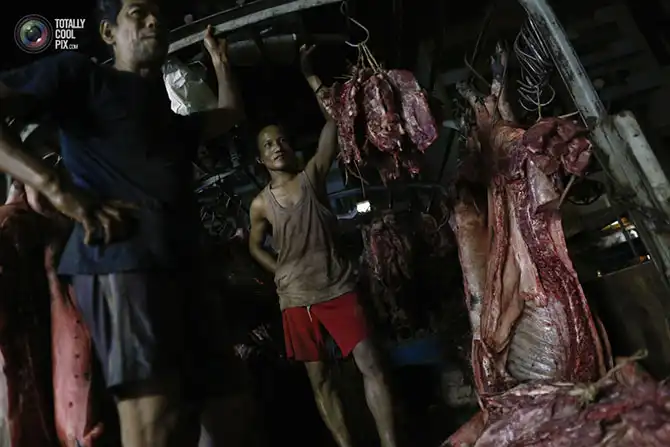 Мужчины разгружают мясо на рынке в Янгоне, Мьянма.