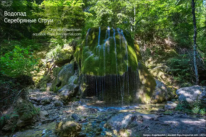 Это совсем небольшой водопадик, текущий по каменной глыбе, покрытой толстой зеленой шапкой мха. Ярко-зеленый летом, оранжево-красный осенью и серебряно-белый с замерзшими струями воды зимой… Именно из-за своего зимнего вида он и получил свое название – Серебряные Струи