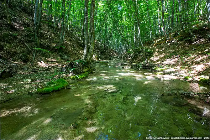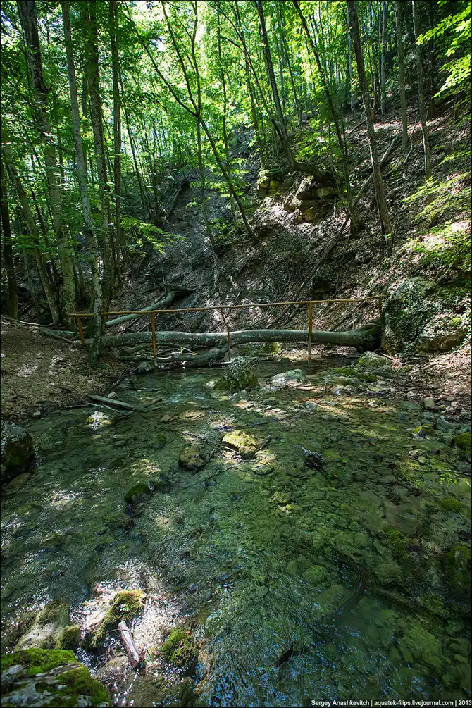 В нескольких местах неглубокий бурлящий поток нужно пересекать. Сначала по мостику, а затем по стволу упавшего дерева.