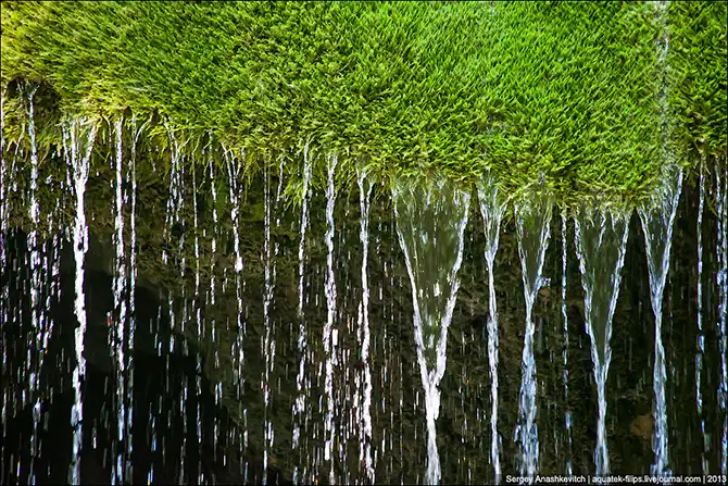Вода буквально сочится из мха. Летом, когда воды в горах немного, ее потоки почти не видны на мощной зеленой шапке.