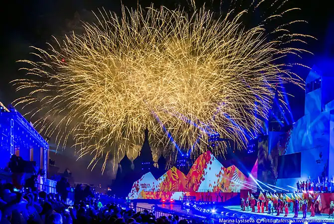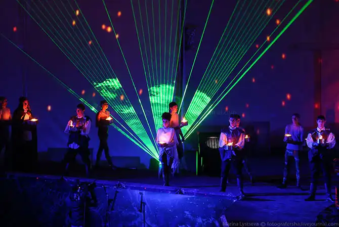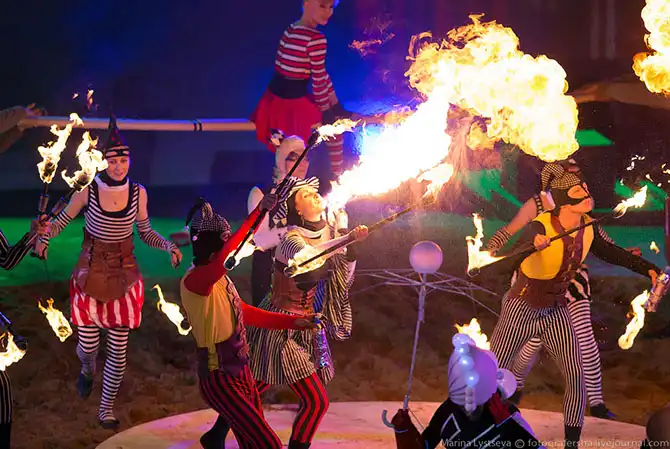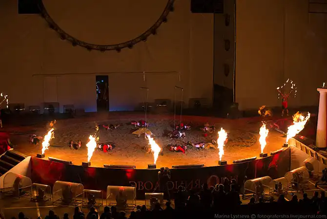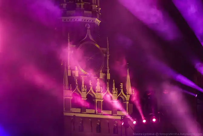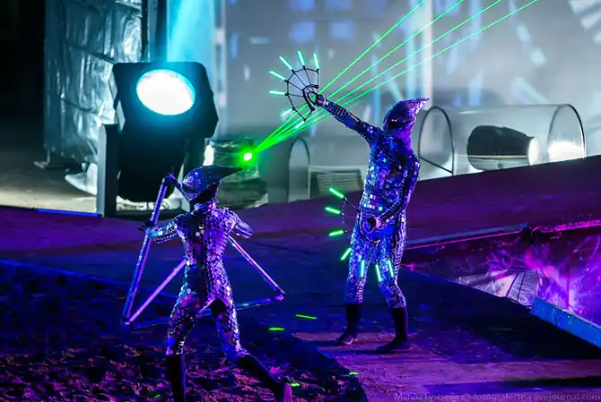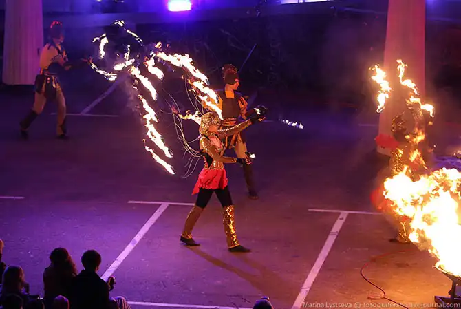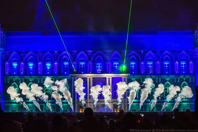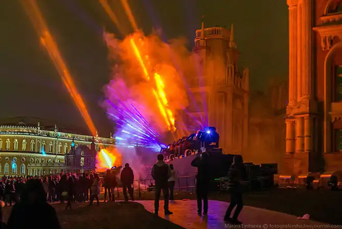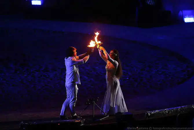 В течение светового спектакля зрители стали свидетелями путешествия огня из одной эпохи в другую — от Античности до наших дней.