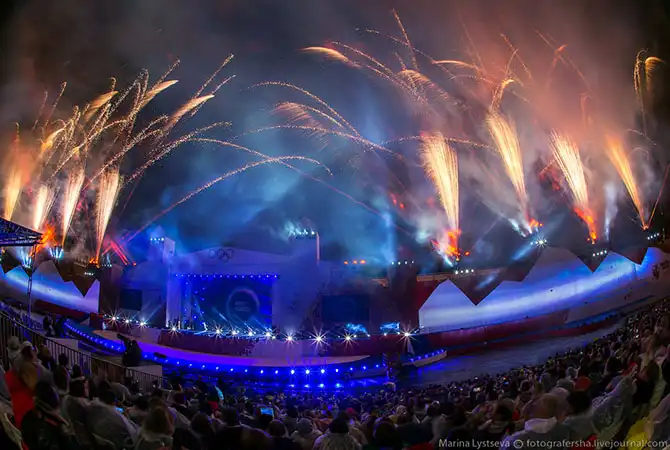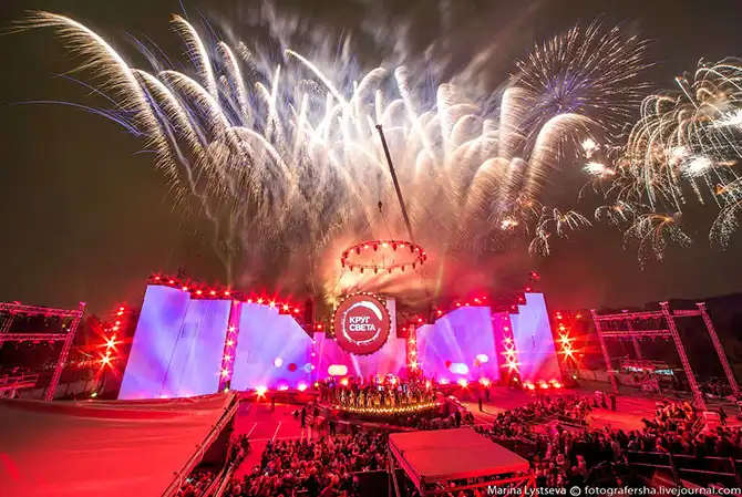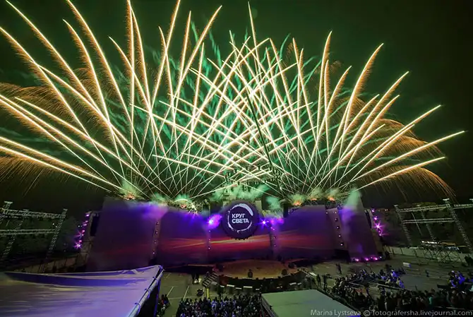 Открытие Международного фестиваля «Круг света» состоялось в Лужниках. На сцене, установленной около бассейна, было показано 33-минутное шоу «Эволюция огня», которое завершилось пятиминутным высотным фейерверком с Лужнецкой набережной.