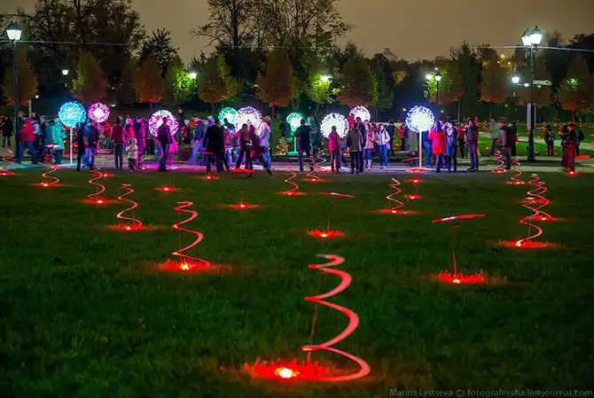 На входе посетителей встречают светящиеся шары, спиральки и ромашки, переливающиеся разными цветами: