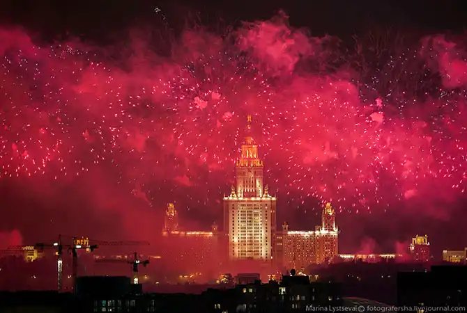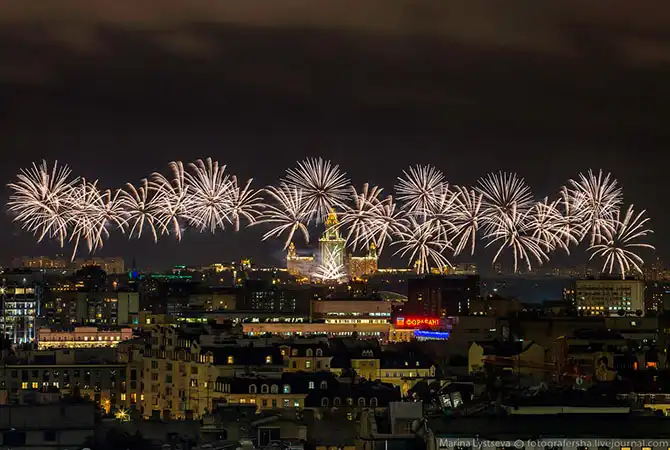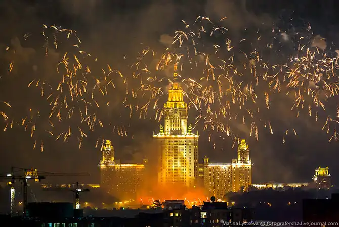 Большой фейерверк около МГУ. Обещанный фронт в километр растянулся визуально как будто на два. Никогда такой ширины раньше не видела, красота!