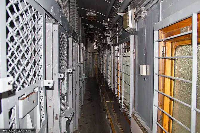Вагон-дефектоскоп магнитный. Впервые в жизни увидел вагон с эркерными окнами. Такие вагоны использовались для обнаружения дефектов железнодорожного покрытия. Принцип действия магнитного искателя основан на использовании магнитодинамического поля, возникающего в рельсе при намагничивании его движущимся постоянным магнитом. Дефект обнаруживается по изменению плотности вихревых токов и направления движения магнитного потока, обтекающего трещину в рельсе: