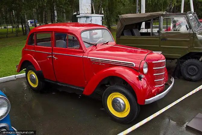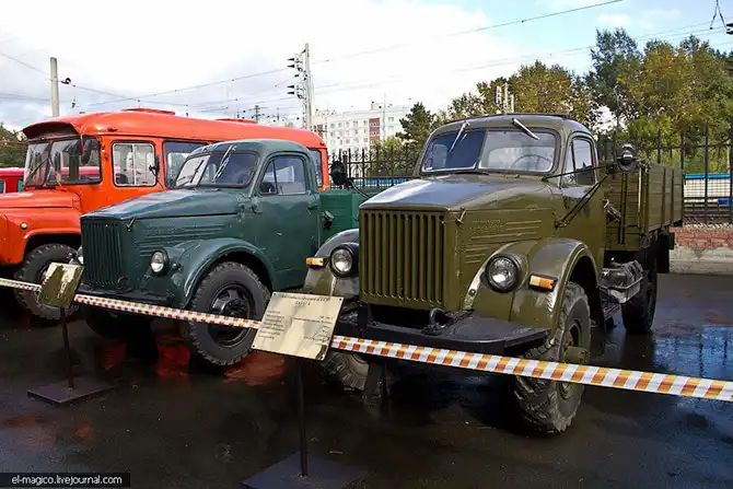 Слева — ГАЗ 51 — самый массовый советский грузовик. В серийное производство попал в 1946 году, хотя первые опытные образцы были собраны до Великой Отечественной. Всего выпустили почти 3.5 млн экземпляров различных модификаций. По советским чертежам выпускался в Корее, Китае и Польше. Справа -ГАЗ 63А — полноприводный грузовик. Выпускался 20 лет с 1948 по 1968 года. Степень унификации с коллегой по левую сторону кадра 80%: