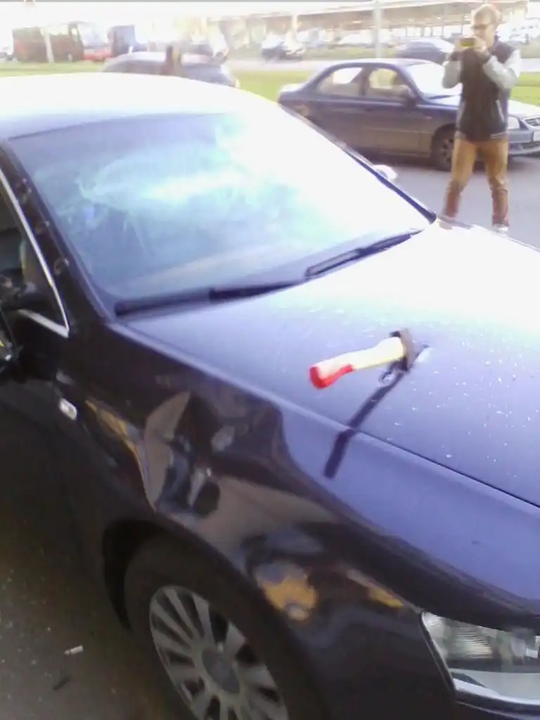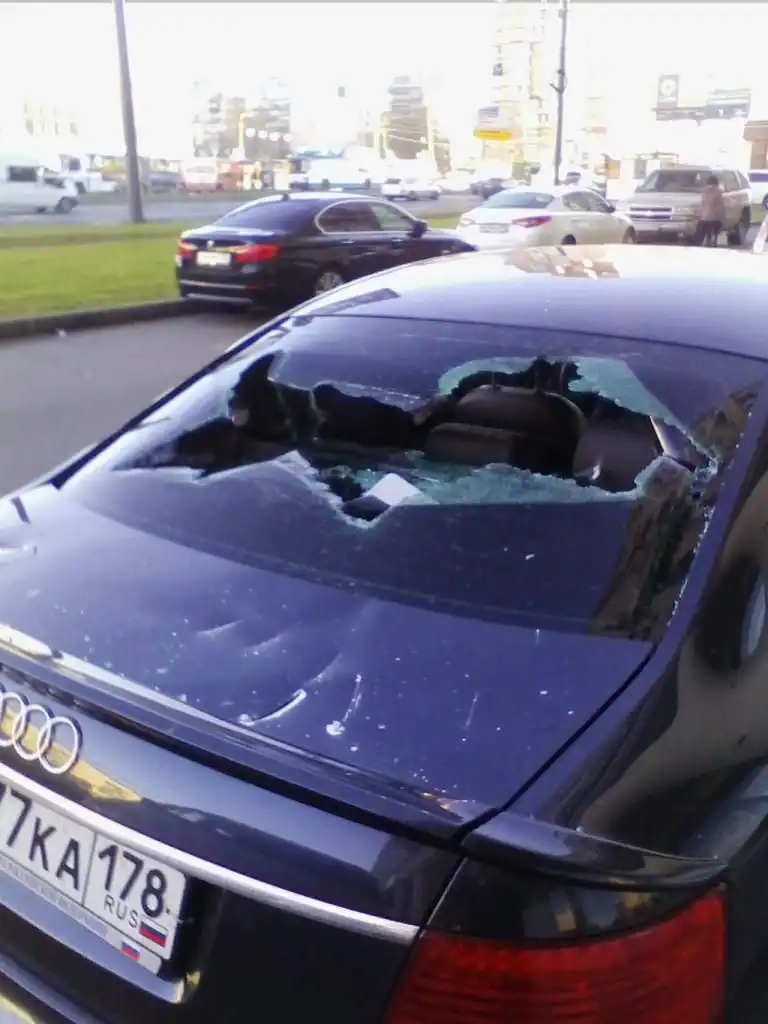 Следущие фотографии сделаны в петербургском районе Купчино. В автомобиле Audi, припаркованном на тротуаре рядом с «Евразией» на проспекте Славы, все окна были выбиты с помощью новенького топора, который был оставлен на месте преступления торчащим из капота. Второй топор — лежал под автомобилем.