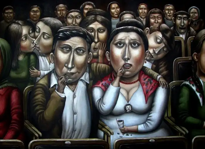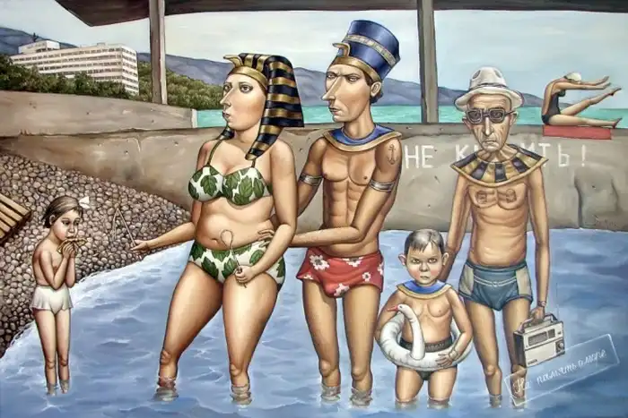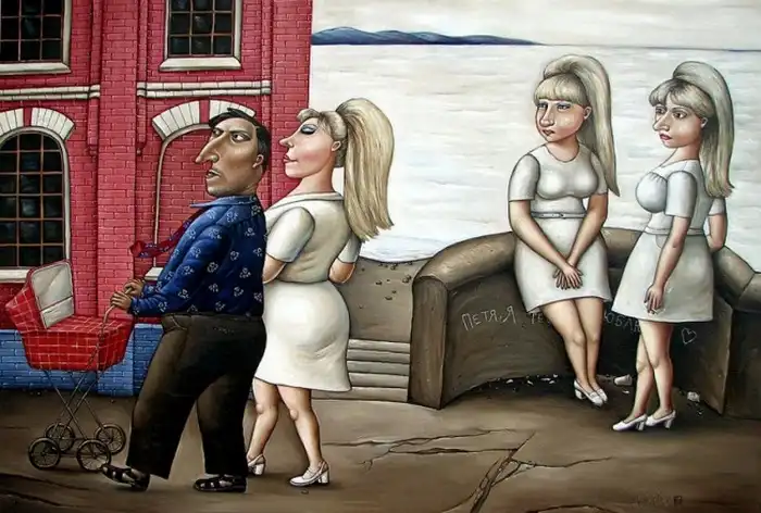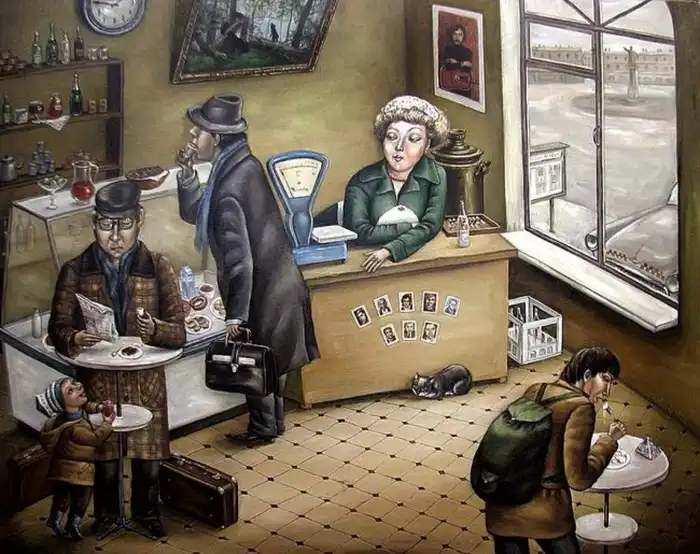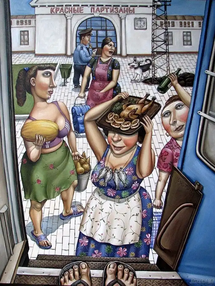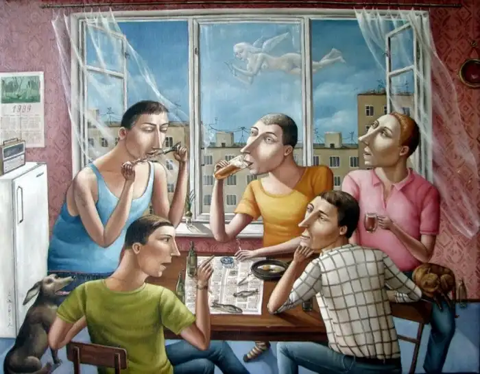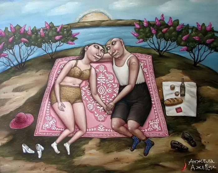 Глядя на эти картины понимаешь, что близки и понятны они могут быть только русскому человеку. Их автор, художница Анжела Джерих, говорит о своих работах так: "Рисую с утра до ночи всех нас. И всё у нас будет хорошо!" Автор с юмором и ностальгией показывает ушедшую эпоху, помогает вспомнить советское прошлое и узнать знакомые бытовые ситуации.