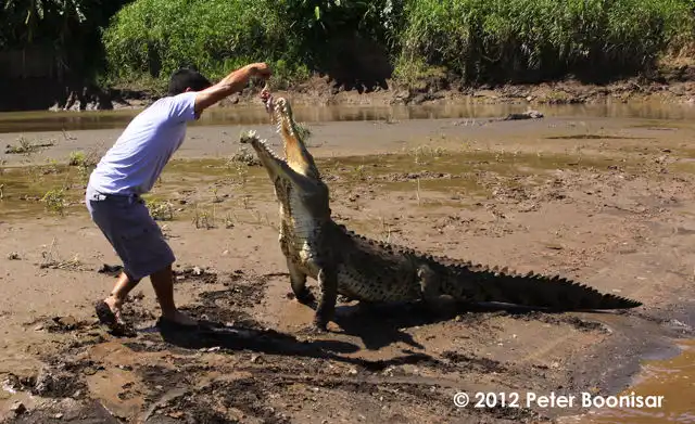 Мужчина заманивает крокодилов, сырыми куриными суп наборами, а затем кормит их с рук. Хосе говорит, что рептилии не настолько опасны и агрессивны, как думают люди.