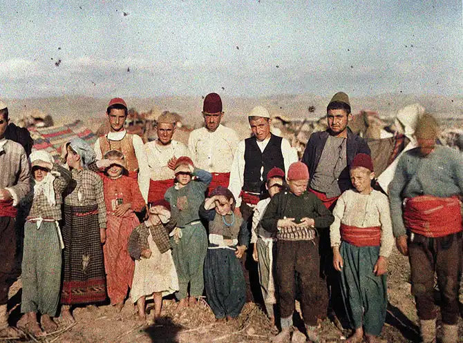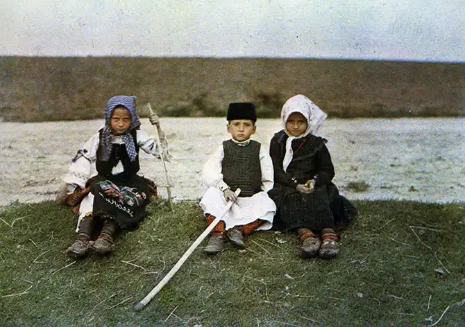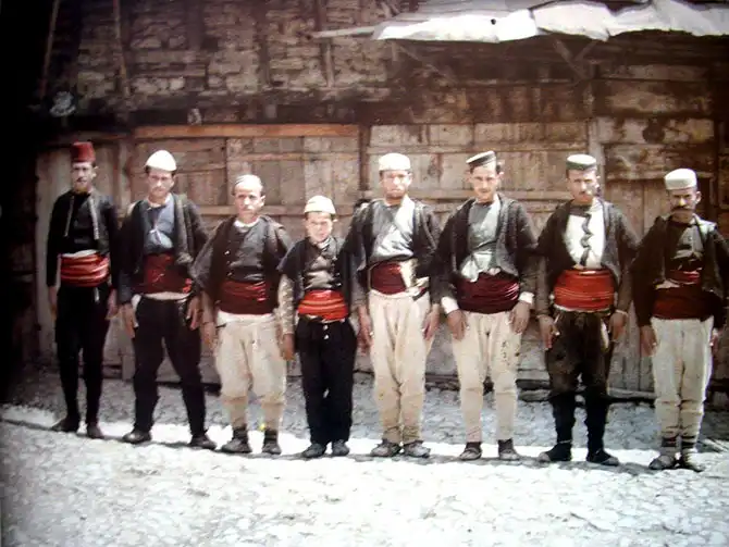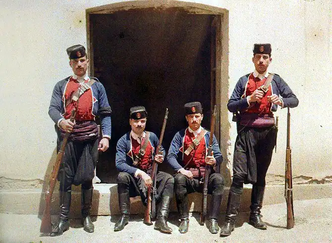 Болгария. Солдат и болгарские ополченцы, сопровождающие фотографа. Мельник. 1913