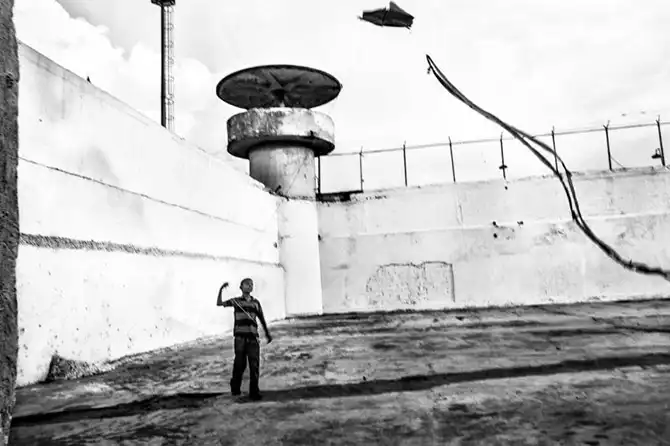 Парень запускает бумажного змея на территории тюрьмы. За ним – смотровая башня.