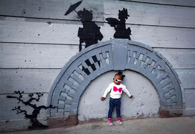 Ребёнок фотографируется возле граффити авторства британского художника Бэнкси в Бруклине, Нью-Йорк, 17 октября.