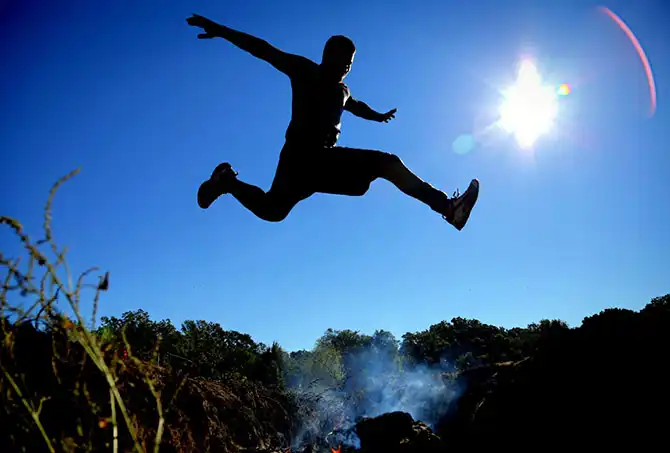 Участник соревнования Mad Max Mud Run прыгает через яму, в которой горит костёр, в Париже, штат Техас, 19 октября.