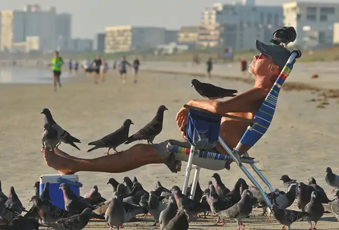 Местный житель Терри Зиттл часто отдыхает на пляже Коко-Бич в штате Флорида, США, 27 октября. К нему слетаются все голуби округи, так как он приносит с собой семечки. Многим из своих пернатых друзей Терри дал имена.