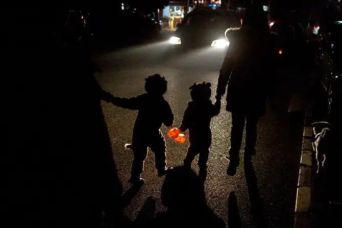 Дети в костюмах с и фонариками-тыквами идут к соседям за угощением накануне Хэллоуина в Пекине, Китай, 30 октября.