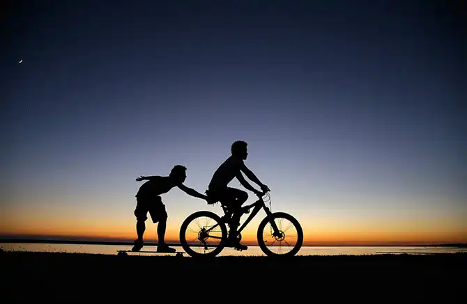 Мальчик едет на велосипеде и везёт своего друга на лонгборде в Мандевилле, штат Луизиана, США, 28 октября.