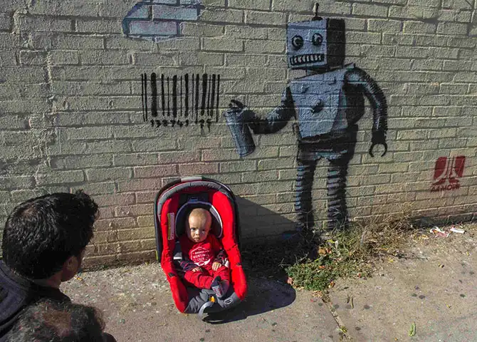 Женщина фотографирует своего семимесячного сына возле нового граффити британского художника Бэнкси на стене в районе Кони-Айленд, Нью-Йорк, 28 октября.