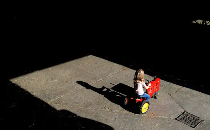 Девочка катается на игрушечном тракторе в конюшне на ферме Hillside Farms в Далласе, штат Пенсильвания.