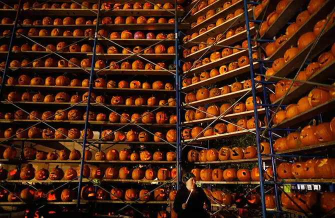 Женщина стоит возле стеллажа с тыквами в Хайвуде, штат Иллинойс, 18 октября. Организаторы фестиваля тыквы в Хайвуде пытались установить рекорд Гиннеса на самое большое число светящихся фонарей из тыкв.