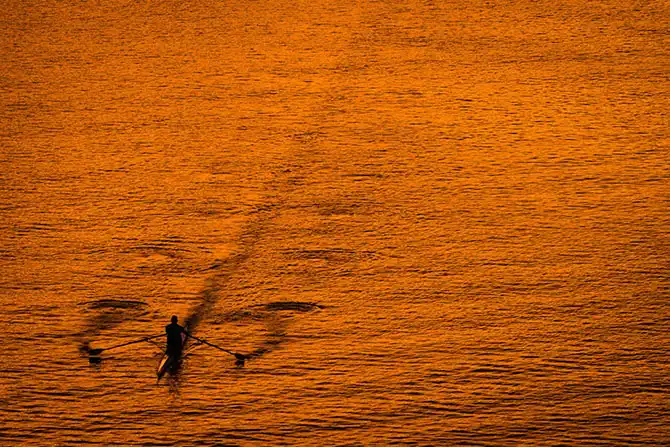 Лодочник плывёт по реке Потомак на закате в Вашингтоне, округ Колумбия, США, 8 октября.