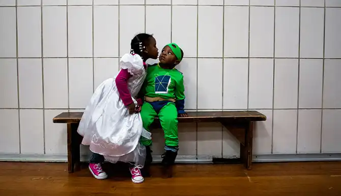 Девочка в костюме принцессы целует своего брата-супергероя на празднике, посвящённом Хэллоуину, в школе в городе Флинт, штат Мичиган, 29 октября.
