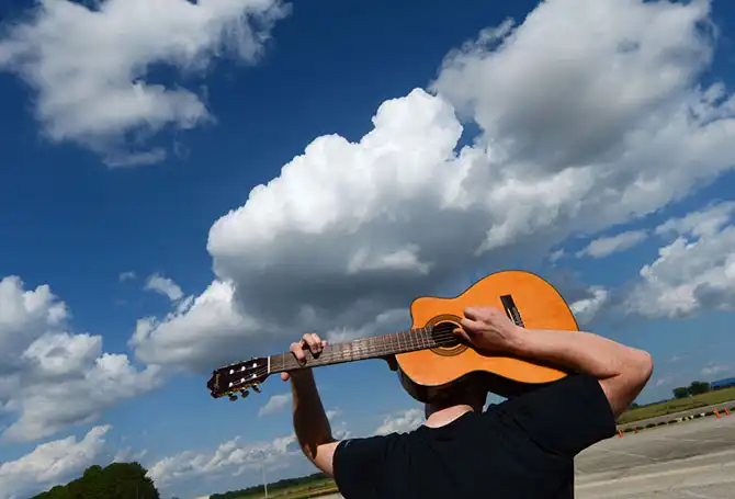 Мужчина играет на гитаре в ожидании своей жены на стоянке возле колледжа Калхун Коммьюнити в Декатуре, штат Алабама, 1 октября.