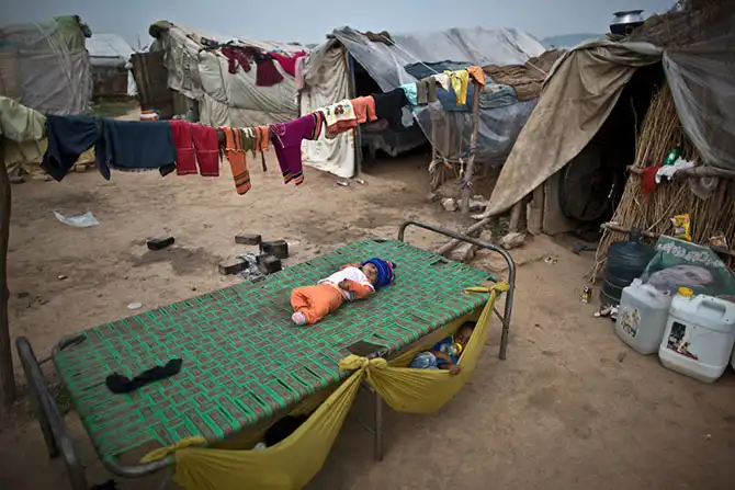 Дети спят на раскладушке и в привязанных к ней гамаках в трущобах в Исламабаде, Пакистан, 30 октября.