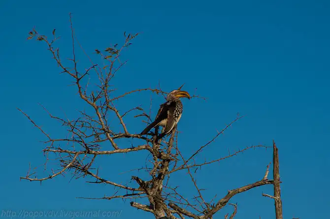 В Мкузе очень много разнообразных птиц. Снимать их в движущейся машине практически невозможно, но пропустить такую красавицу было невозможно. Одна из представительницей птиц-носорогов.