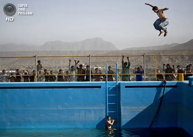Афганцы плещутся в бассейне под открытым небом, построенном советскими специалистами более 30 лет назад. Афганистан. Кабул. 17 мая 2013 года.