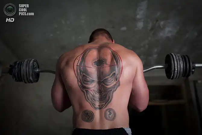Немецкий солдат с эффектной татуировкой на всю спину во время силовых упражнений на боевом посту. Афганистан. Чар-Дарах, Кундуз. 17 сентября 2011 года.