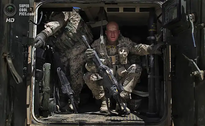 Немецкие солдаты из отряда быстрого реагирования прибывают на базу после миссии. Афганистан. Кундуз. 10 сентября 2009 года.