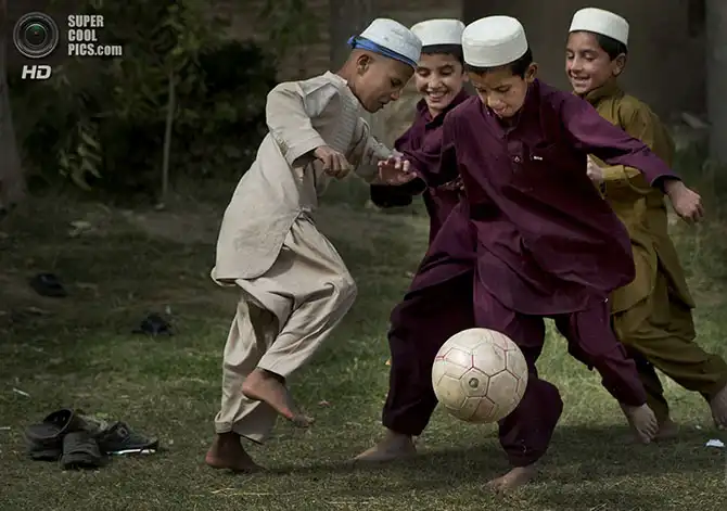 29 октября 2013 года. Мальчики играют в футбол во время перемены между уроками в школе.