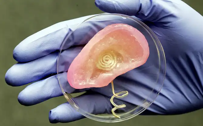 Фотография в 3D бионического уха, созданного Майклом МакЭлпайном и его командой в Принстонском университете. Эти «бионические уши» используют технологии 3D печати, чтобы совместить электронику с тканью, создавая ухо, которое не только имитирует человеческий слух, но и улучшает его. Ухо является экспонатом выставки 3D Printshow в Лондоне.