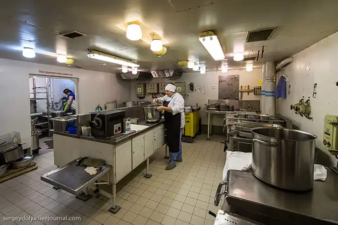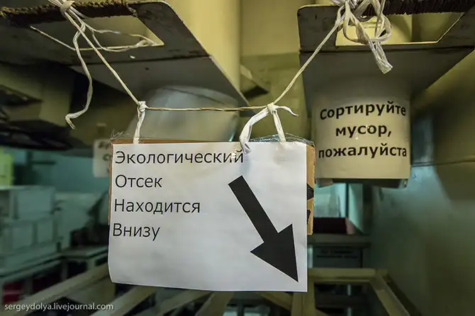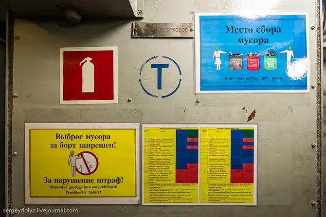 Тут собирают и сортируют разный мусор: обратите внимание, справа есть подробная инструкция, что и как необходимо делать. Разумеется, за нарушение установленного порядка (выброс мусора за борт) – штраф: