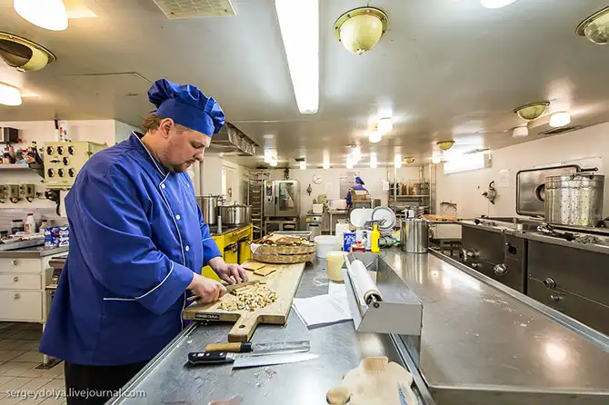 Один из су-шефов за работой. Меню на корабле было весьма разнообразным: для пассажиров, матросов и офицеров готовили разные блюда: