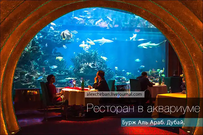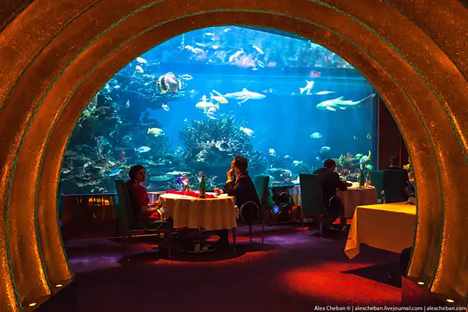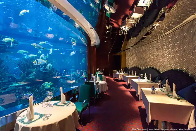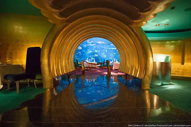Как я уже неоднократно замечал, в хорошем ресторане самое главное – это вид! Кухня почти наверняка будет безупречна, поэтому сегодня хочу показать интерьеры подводного ресторана под «парусом», т.е. под гостиницей Бурж Аль Араб – символа Дубая. В этом отеле для клиента не существует слова «нет» в ответ на его просьбу, абсолютно все пожелания могут быть исполнены. За несколько дней всестороннего тестирования этого знаменитого отеля был найден только один нюанс – в подводном ресторане «Al Mahara» не приготовят рыбку из аквариума по заказу! Шутка конечно, но факт остается фактом.