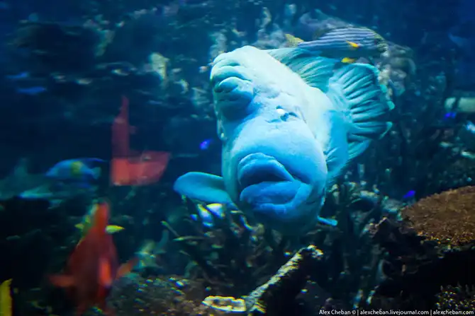 Среди всех аквариумных рыб я впервые встречаю экземпляр с интеллигентным выражением лица! Вы только посмотрите, это же поэт! Его зовут Джорд, он – визитная карточка ресторана уже на протяжении 11 лет. Впрочем, этот вид рыб может менять пол и, кто знает, может он уже давно не Джордж, а Джорджета?!