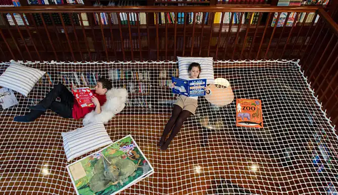 Пример необычного подхода к использованию пространства продемонстрировала, испанская творческая студия Playoffice. Дизайнеры студии разработали «сетку для чтения» — плотную ткань, которая отделяет часть библиотеки, и создает таким образом второй этаж, где взрослые и дети могут наслаждать чтением.