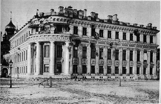 Для начала, чтобы выбить юнкеров, Кремль подвергся артобстрелу. Вот, например, как выглядел в результате Малый Николаевский дворец, который в конечном итоге снесли и построили вместо него и монастырей большое административное здание, занимаемое ныне Администрацией Президента