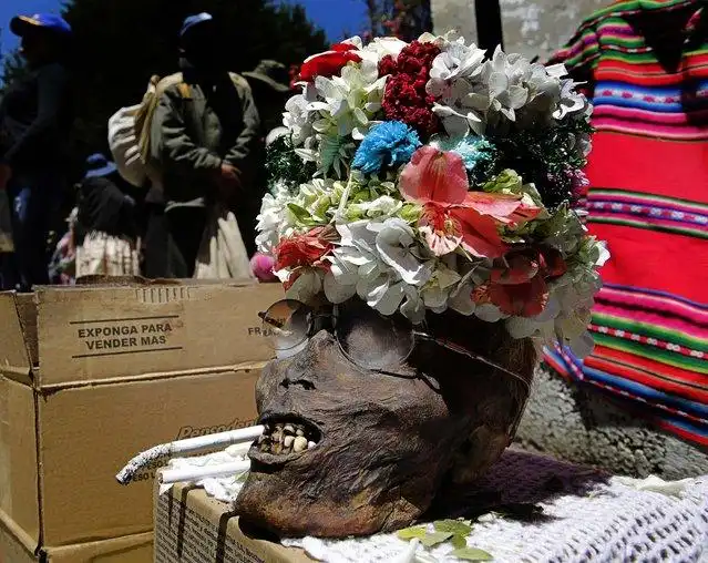Украшенный человеческий череп или » natita » будет экспонироваться в рамках фестиваля Natitas на главном кладбище в Ла-Пасе, Боливия.