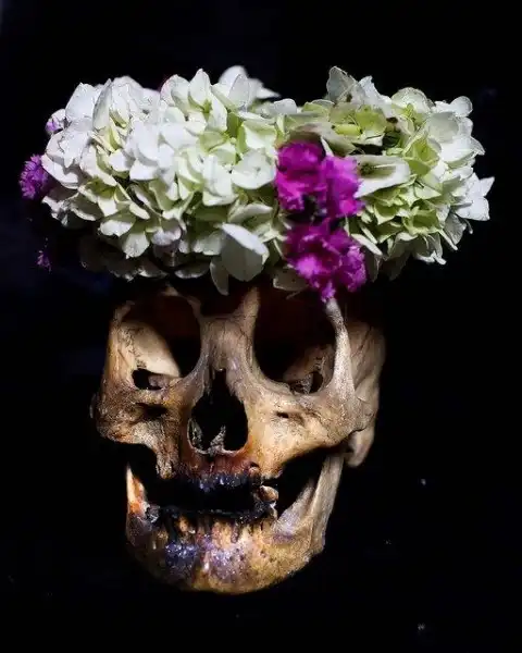 Украшенный человеческий череп при свете свечей во время фестиваля Natitas .