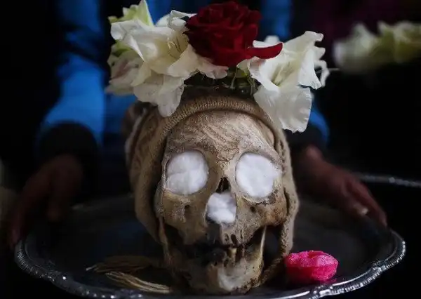 Мужчина удерживает на голове украшенный череп. Внутри часовни главного кладбища во время проведения фестиваля Natitas .