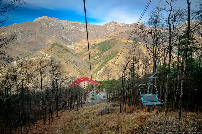 На канатной дороге горнолыжной трассы, внизу – ЛОК Армхи
