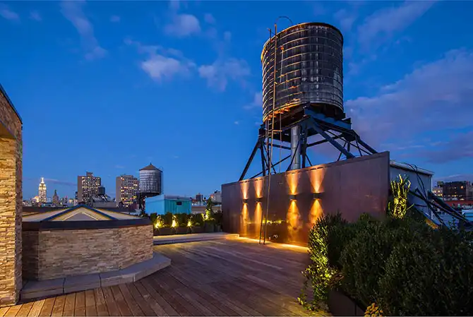 В Нью-Йорке на продажу выставлен шикарный пентхаус стоимостью $32 миллиона. Двухэтажная резиденция с террасой на крыше занимает площадь около 700 кв. метров. На нижнем уровне апартаментов расположены просторная гостиная с панорамным видом на Манхэттен, объединенная со столовой и кухней, кладовая, винный погреб, прачечная, гостевой санузел, тренажерный зал, домашний кинотеатр, спа-комната, сауна, массажный кабинет и три спальни с ванными и гардеробными. На верхнем уровне спроектирована четвертая спальня, ванная и кабинет. На крыше пентхауса оборудованы зона отдыха, летняя кухня и столовая.