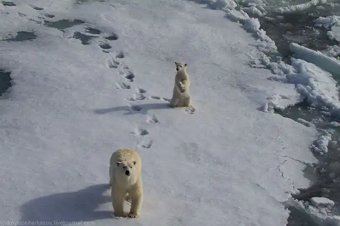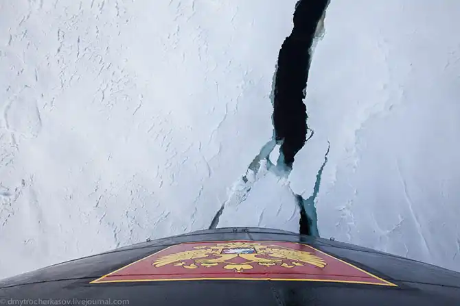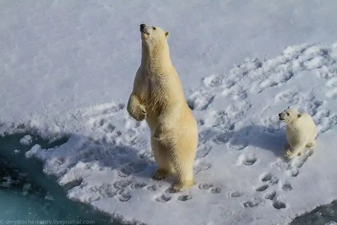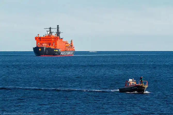 Из-за того, что естественных врагов у них нет, медведи довольно любопытны. Конечно, большинство из них предпочитают держаться от атомного ледокола подальше. Все-таки разница в размерах колоссальная. Но некоторые с интересом подходят прямо к борту и пытаются разглядеть, что творится на палубе.