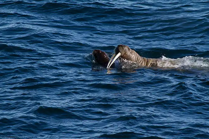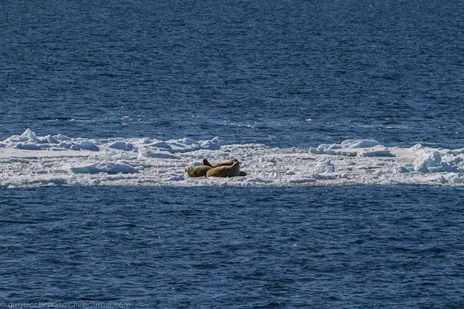 Кроме белых медведей нам еще попадались моржи. Они менее пугливы, чем нерпы. Хотя взрослый медведь иногда способен на суше справиться и с моржом. В воде же они чувствуют себя вполне безопасно. Часто их лежбища располагаются прямо на больших льдинах.