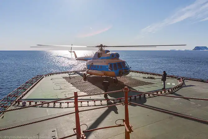 На борту нашего ледокола находился вертолет МИ-8 с экипажем. Обычно такие большие вертолеты не используются для реальной работы в море. Для ледовой разведки достаточно более экономного и меньшего по размерам МИ-2. Однако в нашем случае предполагалась высадка людей и доставка оборудования, поэтому выбор пал именно на этот тип вертолета.