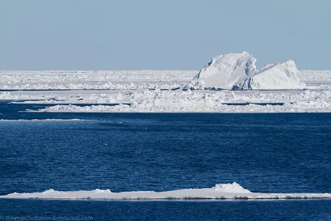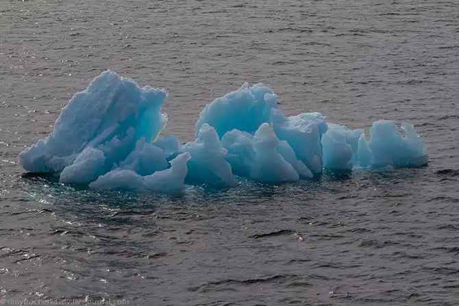 Совсем скоро отдельные льдины сменились целыми ледовыми полями. Начали попадаться небольшие айсберги.